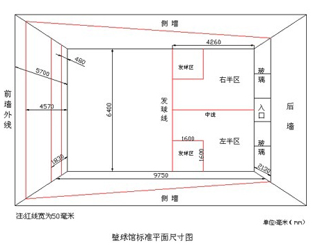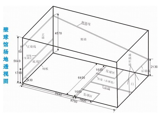 一、 場地標(biāo)準(zhǔn)(國際標(biāo)準(zhǔn)競賽場地) 寬6.4米,長9.75米,前高4.57米,后高2.13米,天花高度5~6米,響板高度0.48米,正面發(fā)球線高度1.83米,地面發(fā)球線距后墻4.26米,半場線將地面發(fā)球線與后墻從中心向左右平分,發(fā)球區(qū)為1.6米見方。